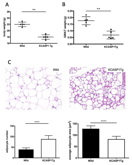 KCASP1Tg mice showed low gonadal white adipose tissue (GWAT) weights and degenerated adipose tissue (AT). (A) The whole body and (B) GWAT weights were decreased in KCASP1Tg compared to wild littermate mice at 10 weeks of age. (C) Representative photomicrographs of the hematoxylin and eosin (HE) (×400) staining of the GWAT of wild littermate and KCASP1Tg mice at 10 weeks of age. Histological sections were 3.5 µm thick. Adipocyte number and adipocyte area were measured by using ImageJ and Adiposoft (three parts of each slide, n = 3 in each group). Adipocytes were significantly smaller and larger in number in KCASP1Tg. (D) Immunohistochemical staining (×400) was performed to characterize stromal cells. Lymphocytes, monocytes and neutrophils were slightly higher in KCASP1Tg but not significantly so. ** p < 0.01, **** p < 0.0001 versus control.