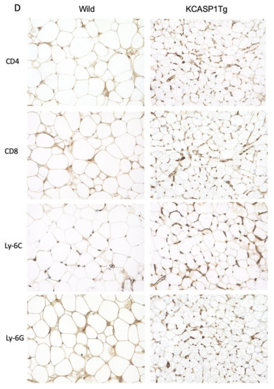 We measured whole-body and GWAT weights with a precision electronic balance to evaluate the effect of dermatitis on the AT. The whole-body and GWAT weights were significantly lower in KCASP1Tg than in wild littermate mice at 10 weeks of age (Figure 1A,B). Next, we evaluated the phenotype of adipocytes in GWAT using hematoxylin and eosin staining (HE). In KCASP1Tg mice, adipocytes were small in size and irregularly shaped compared to in wild type mice (Figure 1C). Abundant mononuclear cell infiltration compared to in control mice suggests the so-called burnout or worn out condition of the adipocytes. We performed immunohistochemical (IHC) staining to identify the stromal cells of AT such as T cells, monocytes and neutrophils. The infiltration of inflammatory cells such as lymphocytes, monocytes and neutrophils was slightly higher in KCASP1Tg mice compared to that in wild type littermates (Figure 1D).
