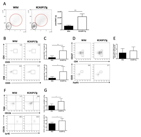 We assessed the number or proportion and characteristic composition of the stromal cells infiltrating the GWAT by flow cytometry. The number of infiltrated stromal cells, including lymphocytes and monocytes, was significantly increased in KCASP1Tg mice (Figure 2A). Next, we verified the characteristics of the lymphocytes and monocytes. We measured the proportion of the CD25+ T cells (Figure 2B). Activated T cells, both CD4+ and CD8+, were increased in KCASP1Tg mice (Figure 2C). Additionally, we measured the proportion of regulatory T cells by using CD127, CD4, CD25 and Foxp3 antibodies (Figure 2D). The regulatory T cells were increased in KCASP1Tg, but there was no significant difference (Figure 2E). Finally, we measured the number of TLR4+ CD11b+ monocytes and proportion of Ly-6C+ CD11b+ monocytes TLR4+ CD11b+ monocytes were significantly increased in KCASP1Tg, and Ly-6C+ CD11b+ monocytes were also increased (Figure 2F,G).