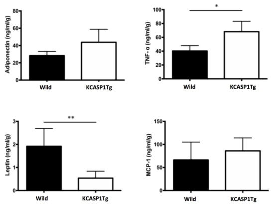 An adipocytokine is a physiologically active substance secreted from adipocytes, and the amount secreted also changes depending on the environment of the adipocytes. Representative adipocytokines such as adiponectin, TNF-α, leptin and MCP-1 were analyzed in the adipocytes of GWAT using a specific ELISA kit (Figure 3). The TNF-α level was significantly elevated in KCASP1Tg mice compared to in controls. Conversely, KCASP1Tg mice showed a lower leptin level.