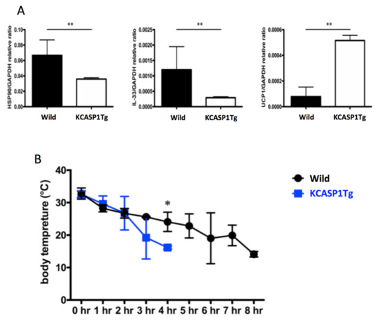 HSP90, IL-33 and UCP-1 are deeply involved in thermogenesis in adipocytes, and their expression is increased by cold exposure or adrenergic stimulation. We investigated the heat production upon cold exposure challenge and the expression of these thermogenic genes. After 4 °C cold exposure, the mRNA expression of HSP90, IL-33 and UCP1 in adipocytes was quantified using real time-PCR. The mRNA expression of HSP90 and IL-33 was significantly decreased in KCASP1Tg mice (Figure 4A). Although the mRNA expression of UCP1 was significantly increased in KCASP1Tg mice (Figure 4A), the body temperature decreased more rapidly upon exposure to the cold environment, and the KCASP1Tg mice could not survive for a long time (Figure 4B).