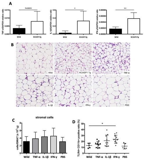We hypothesized that cytokines produced in inflamed skin affect AT and measured the mRNA expression levels of inflammatory cytokines in the skin of KCASP1Tg and control mice. The mRNA expression levels of TNF-α, IL-1β and IFN-γ in ear skin were measured by real-time PCR. All cytokine levels were significantly increased in KCASP1Tg mice (Figure 5A). To clarify the direct effect of skin-derived cytokines on GWAT, we treated wild-type mice by the intraperitoneal administration of inflammatory cytokines including TNF-α, IL-1β and IFN-γ. The GWATs of the TNF-α-treated wild-type mice were similar to those of KCASP1Tg mice; the adipocytes were large in number, small and irregularly shaped; IL-1β- and IFN-γ-injected mice also showed a similar trend (Figure 5B). The number of infiltrating stromal cells tended to increase in mice that were administered cytokines (Figure 5C); additionally, TLR4+ CD11b+ monocytes were significantly increased in IFN-γ treated mice (Figure 5D).