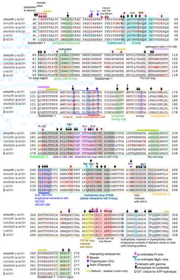 Annotated alignment of the six actin sequences for Homo Sapiens showing the positions of mutations. All six sequences were retrieved from UNIPROT (P63267: smooth γ-actin, P60709: β-actin: P68133: skeletal α-actin, P63261: γ-actin; P60382: cardiac α-actin, P62736: smooth α-actin). The first one–two residues are typically acetylated and cleaved, such that the third residue is the first residue in the expressed sequence. The positions of key interaction regions in the sequences is indicated together with positions of mutated residues (red font) in each sequence. Residues in which mutations are found in four out of the six isoforms are indicated by a red star. See text for more details. Numbering in the text refers to the residue number for α-actin isoforms. Mutations were retrieved from the Human Genome Mutation Database (HGMD).