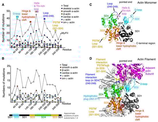 A detailed knowledge of the structure of actin is important in predicting the precise effects of mutations. Indeed, the analysis presented here suggests that many mutations are likely to affect actin polymerization. However, some mutations will also affect the interaction of actin with its many other interacting proteins []. Other specific mutations can affect post-translational modifications [] important for actin polymerization.