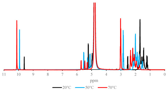 To further explore the composition and variability of glutaraldehyde solutions, NMR spectra were recorded for GA (25%) at 20, 50, and 70 °C after mixing with D2O (1:1 volume ratio). The spectra (Figure 2) showed signals in the aldehyde region (9.5–10 ppm), the aliphatic region (1–3 ppm), and in the region specific to protons directly attached to unsaturated groups (5–6 ppm). At any given temperature, only one signal was observed in the 9.5–10 ppm region; hence, either the aldehyde proton was identical between glutaraldehyde and all of its aldehyde-containing byproducts, or glutaraldehyde was the only aldehyde present. The 5–6 ppm signals were neither purely aliphatic nor aldehydic, and may hence be assigned to crotonic-type condensation products of aldehyde, but not to glutaraldehyde itself. The 1–3 ppm signals are expected to arise from glutaraldehyde as well as from its reaction/degradation products.