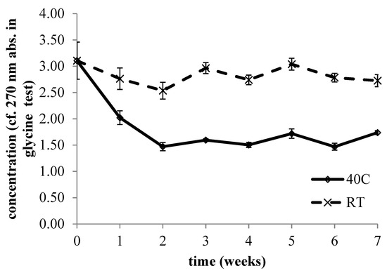Time evolution for 8 weeks of GA concentration at 40 °C and at room temperature, as measured by titration with glycine.