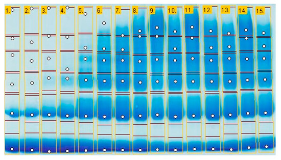 Glutaraldehyde is extensively employed for the polycondensation of hemoglobin (Hb) and other proteins [20,21,22]. Here, Hb and myoglobin were employed in condensation reactions, under conditions similarly employed previously for other proteins [23]. Figure 4 shows such data, where the efficiency of the condensation was estimated using SDS-PAGE, with Table 3 showing the changes in relative proportions of fractions of various molecular weights. Lanes 8 and 10 show Hb polymerization with a 3 mM GA solution incubated for 8 weeks at room temperature and at 40 °C, respectively (to be compared with lane 5). Lanes 9 and 11 show the same experiments, now with 5 mM. Lanes 12–15 repeat the same experiments now for GA incubated in the presence of isopropanol, a typical ingredient in biocides, so as to assess its effect on GA stability; in this case, an accelerated protocol of aging was also employed, heating the GA samples (prior to reaction with Hb) to 60 °C for up to 24 h. One may expect that, upon incubation, the decrease in GA concentration would lead to decreases in the relative contributions of the higher molecular weight fractions. Yet, the incubated samples all featured stronger contributions of the higher molecular weight bands, compared to their reference non-incubated samples from the calibration set. For instance, the 3 mM sample incubated for 8 weeks had a relative intensity of 0.65 for the highest molecular weight region of the lane, compared to 0.00 for the reference non-incubated sample. In the case of the 5 mM sample, the highest molecular weight fraction even reached 1.00. On the other hand, the 3 mM sample incubated for 8 weeks at 40 °C expectedly showed slightly lower contributions of the higher molecular weight bands compared to the sample incubated at room temperature, which was likewise the case for the 5 mM sample at 8 weeks (40 °C vs. room temperature (RT)).