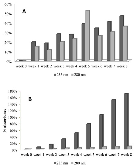 Evolution of absorbance in the UV-VIS spectra of 28.2 mM GA, at room temperature (A) and at 40 °C (B), for 8 weeks. See also Figures S10–S13.