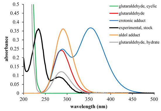 The UV-VIS spectra of GA featured two major bands at 235 and 280 nm (Figure 5), previously assigned to sigma and/or pi transitions in the carbonyl groups. In order to clarify this issue, DFT calculations were employed for computing the UV-VIS spectrum of GA, as well as of some of its derivatives (cf. Figure 6). The computed spectrum of GA showed only a band at 290 nm, assigned to n-pi* transitions (orbitals shown in Table S2). This implied that the 235 nm band, already present in the commercial stocks of GA, was due to products of GA auto-condensation/degradation. As seen above (Figure 5), in the incubated samples, this band drastically increased in intensity over time, suggesting a distinct increase in the concentration of GA degradation products. Figure 6 shows DFT-computed spectra for a few of these products; on the basis of these, one may conclude that incubation of GA leads to relative increases in the contributions of less-conjugated chromophores such as hydrates or cyclic adducts, that is, those that display maxima below 250 nm rather than at 280 nm or higher (note that the time-dependent DFT (TD-DFT) protocol has an inherent error that may reach tens of nanometers [24]).