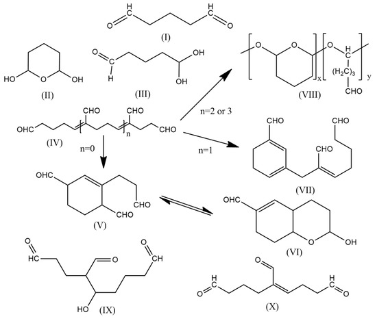 Commercial GA is typically available at a 25% nominal concentration, but its concentration in biocides may vary. There are a few methods for the determination of GA concentrations. One option involves spectrophotometric titration using a mixture of phenol solution and perchloric acid [4]. This method is used only for methanolic samples. Other methods involve column chromatography [5,6,7,8], electrophoresis [9], or iodometric titration [10]. However, even in “pure” solutions, GA (I in Scheme 1) undergoes a wide range of reactions, including at a first stage cyclization (II), hydrate formation (III), and dimerization via aldolic (IX) and crotonic condensation (X). Subsequent reactions also occur, as previously described. Scheme 1 illustrates the chemical structures of products previously shown to be present in GA solutions [11].