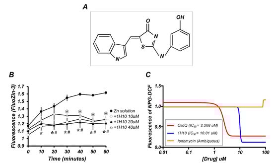 1H10 has a zinc-chelating capacity. (A) Chemical structure of 1H10. (B) FluoZin-3 fluorescence level was measured at the indicated time points after 15 min of exposure to 300 µm zinc with or without the three different concentrations of 1H10 (10, 20, or 40 µM) in mouse neuronal cultures. Data are mean ± SEM (n = 3). @, #, and *: p < 0.05 versus zinc alone at the same time point (unpaired Student’s t-test). (C) In the test tubes, the fluorescence of Newport Green DCF (NPG-DCF, 0.1 μM) was estimated after a 30-min incubation of zinc (20 µM) with or without the drugs (ClioQ; clioquinol, 1H10, or ionomycin) at the different doses (0, 0.2, 0.6, 2, 10, 20, 40, or 100 µM). The half maximal inhibitory concentration (IC50) was calculated by Prism 5.