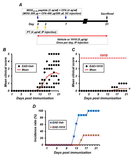 1H10 ameliorates the clinical signs and progression of myelin oligodendrocyte glycoprotein 35-55 (MOG35-55)-induced experimental autoimmune encephalomyelitis (EAE). (A) Timeline showing the experimental design. 1H10 was intraperitoneally administered once per day for the entire experimental course. Mice were then killed on day 21 following the initial immunization. (B,C) EAE clinical scores are shown for both vehicle (B) and 1H10 groups (C) (mean ± SEM; n = 7–8 per group). @, #, and *: p < 0.05. vehicle-treated EAE mice (repeated measure ANOVA; Day: F = 14.691, p < 0.001; Group: F = 11.082, p = 0.001; Day × group interaction: F = 9.429, p < 0.001). (B) Percentage disease incidence of vehicle- or 1H10-treated immunized mice (mean ± SEM; n = 7–8 per group).