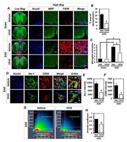 EAE-induced demyelination and microglia/macrophage activation are reduced by treatment with 1H10. (A) Representative microglia/macrophage activation in the spinal cord of sham-operated and MOG35-55-immunized mice (either vehicle or 1H10) at day 21 as shown by immunofluorescence for F4/80 (red). Demyelinated area shown by reduced myelin basic protein (MBP) staining (green). Nuclei stained with 4′,6-diamidino-2-phenylindole (DAPI) (blue). Scale bar, 50 µm. (B,C) Bar graphs showing the percent areas of demyelination (B) and the grades of microglia/macrophage activation (C) as determined in the same spinal cord region (mean ± SEM; n = 3–5 per group). * p < 0.05 vs. vehicle-treated EAE mice; # p < 0.05 vs. sham-operated mice (B) unpaired Student’s t-test; C: Kruskal-Wallis test followed by Bonferroni post-hoc test: Chi square = 13.613, df = 3, p = 0.003). (D) Representative images of ionized calcium binding adaptor molecule 1 (Iba-1, green) and cluster of differentiation 68 (CD68, red) immunopositive cells as merged images for vehicle- and 1H10-treated EAE mice. Nuclei stained with DAPI (blue). Scale bar, 50 µm. (E,F) Quantification of the immunofluorescence intensity of Iba-1 (E) and CD68 (F) as determined in the same spinal cord region (mean ± SEM; n = 4 per group). * p < 0.05 vs. vehicle-treated EAE mice (unpaired Student’s t-test). (G) Colocalization scatterplots of Iba-1 with CD68. (H) Quantitative colocalization parameters of Iba-1 with CD68 determined by measuring Mander’s overlap coefficient (mean ± SEM; n = 4 per group). * p < 0.05 vs. vehicle-treated EAE mice (unpaired Student’s t-test).