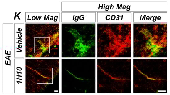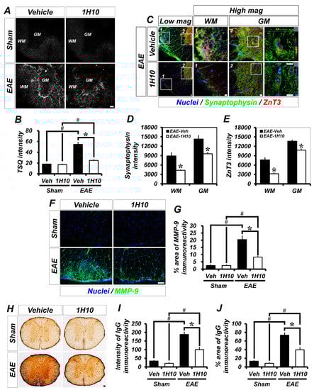 Previously, it was observed that the formation of zinc patches in the spinal cord of EAE mice and these pathological zinc liberations caused EAE-induced white matter destruction and motor deficits [8]. Therefore, to test whether 1H10 treatment could suppress the formation of EAE-induced aberrant zinc-patches, we performed N-(6-methoxy-8-quinolyl)-para-toluenesulfonamide (TSQ) staining at 21 days following the initial immunization with MOG35-55. TSQ fluorescence signals represent chelatable zinc in the spinal cord. Patch-like TSQ fluorescence, which represents abnormal zinc accumulation, was intense in the spinal cord of EAE mice. However, 1H10-treated EAE mice showed a substantial reduction in abnormal zinc patches in the spinal cord (Figure 4A,B). We also assessed whether the 1H10 treatment could reduce the high content of synaptic-vesicular zinc, which is attributable to the formation of aberrant zinc patches, during EAE. The accumulation of synaptophysin, one of the membrane proteins in presynaptic vesicles, is known to be a reliable marker of axonal damage in the central nervous system (CNS) under inflammatory/demyelinating conditions [19]. In the present study, we found that ZnT3 immunoreactivity was colocalized with synaptophysin immunoreactivity. Interestingly, the vehicle-treated EAE mice group showed an increased expression of synaptophysin and ZnT3 in the spinal cord while the 1H10-treated EAE mice group showed significantly reduced synaptophysin and ZnT3 immunoreactivity (Figure 4C–E). Pathological zinc liberation causes a series of events, such as MMP-9 activation and BBB disruption, that result in increasingly deleterious effects. We examined whether 1H10 treatment influenced EAE-induced MMP-9 activation. MMP-9 activity was significantly increased in the spinal cord white matter of EAE mice. However, 1H10 treatment significantly reduced this (Figure 4F,G). Next, to evaluate whether 1H10 treatment affected EAE-induced BBB disruption, we checked for the leakage of serum immunoglobulin G (IgG), which is used to assess putative damage to the BBB. The examination of spinal cord sections revealed an obvious extravasation of IgG in EAE mice that was not present in either vehicle- or 1H10-treated mice after sham surgery. Compared to vehicle-treated EAE mice, there was a significant reduction in IgG extravasation in the spinal cord of 1H10-treated EAE mice (Figure 4H–J). We also sought to determine endogenous serum IgG leakage from spinal cord vessels in EAE mice. Sections from EAE mice were stained for endogenous IgG and the endothelial cell marker (CD31) to highlight vascular permeability around spinal cord vessels. The vehicle-treated EAE mice showed pronounced and diffuse IgG immunoreactivity in the vessels of the spinal cord, reflecting endogenous serum protein extravasation, which obscured the boundaries between the vessel segments. By contrast, 1H10 treatment significantly decreased IgG immunoreactivity in vessels, a result suggesting that the 1H10 treatment of EAE mice preserved the integrity of the BBB (Figure 4K).