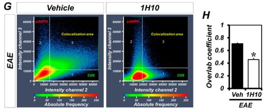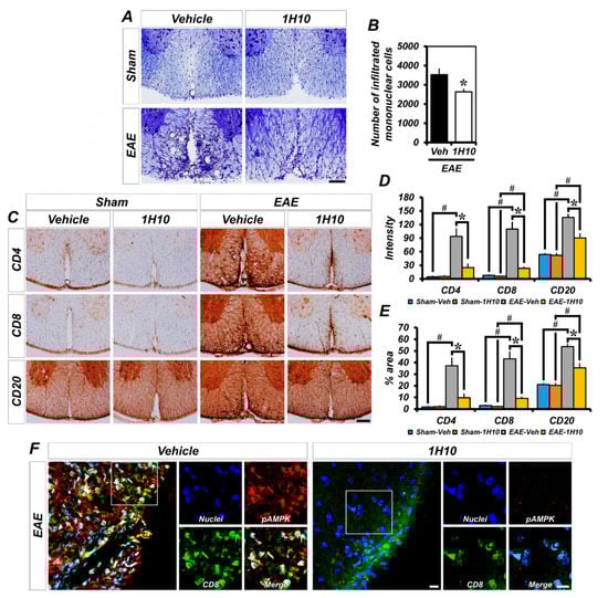 Exposure to MOG35-55 antigen, a peptide and component of myelin, activates the immune system to induce a subsequent immune response specifically targeting myelin through BBB breakdown and mononuclear cell infiltration from the periphery into the CNS. Thus, we first examined EAE-induced mononuclear cell infiltration. EAE mice displayed an infiltration of numerous mononuclear cells into the white matter of spinal cord. As shown in Figure 5A,B, the number of infiltrated mononuclear cells from mice treated with 1H10 was significantly reduced in the spinal cord white matter. We further investigated the presence of major pathogenic immune cells, such as T and B lymphocytes, considered the main drivers in the pathogenesis of EAE, to determine the mononuclear cell population that infiltrated into the CNS. MOG35-55-immunized mice revealed a several-fold increased immunoreactivity of CD4+ T, CD8+ T, and CD20+ B lymphocytes compared to the sham group. The immunoreactivity of CD4+ T, CD8+ T, and CD20+ B lymphocytes that infiltrated into the spinal cord white matter was significantly reduced in 1H10-treated EAE mice (Figure 5C–E). Next, we examined the extent of AMPK phosphorylation in CD8+ T lymphocytes that infiltrated into the white matter of the spinal cord following EAE. We found that most of these had drastically increased AMPK phosphorylation. However, 1H10 treatment not only reduced CD8+ T lymphocyte and p-AMPK immunoreactivity but also significantly decreased the colocalization coefficient (Figure 5F–H). These experiments showed that 1H10 treatment blocks the infiltration of encephalitogenic immune cells into the white matter of the spinal cord.