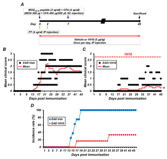 Long-term protective effects of 1H10 after EAE induction. (A) Timeline showing the experimental design. 1H10 was intraperitoneally administered once per day during the entire period. Mice were then killed on day 45 after initial immunization. (B,C) EAE clinical scores are shown for both vehicle (B) and 1H10 groups (C) (mean ± SEM; n = 6–8 per group). * p < 0.05 vs. vehicle-treated EAE mice (repeated measure ANOVA; Day: F = 43.189, p < 0.001; Group: F = 27.293, p < 0.001; Day × group interaction: F = 16.330, p < 0.001). (D) Percentage disease incidence of vehicle- or 1H10-treated immunized mice (mean ± SEM; n = 6–8 per group).