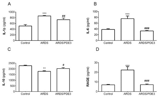 Levels of inflammatory cytokines (A) IL-1β, (B) IL-6, (C) IL-10, and (D) receptor for advanced glycation end products (RAGE) (all in pg/mL) in the lung tissue of healthy ventilated and non-treated animals (Control group), in non-treated animals with ARDS (ARDS group) and in animals with ARDS treated with olprinone (ARDS/PDE3 group) after the 4h therapy. Statistical comparisons: for ARDS vs. Control ** p < 0.01, *** p < 0.001; for ARDS/PDE3 vs. ARDS # p < 0.05, ## p < 0.01, ### p < 0.001. Data are presented as means ± SEM.
