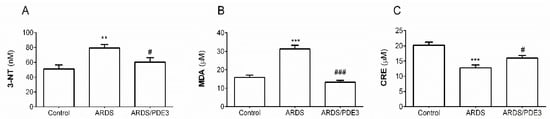 Levels of a marker of (A) oxidative modifications of proteins (expressed in nanomole concentration of 3-nitrotyrosine, 3NT), (B) a marker of lipid oxidation (thiobarbituric acid-reactive substances, TBARS, expressed in micromole concentration of malondialdehyde), and (C) total antioxidant capacity (TAC, expressed in micromole concentration of copper reducing equivalents (CRE) in the lung tissue of healthy ventilated and non-treated animals (Control group), in non-treated animals with ARDS (ARDS group) and in animals with ARDS treated with olprinone (ARDS/PDE3 group) after the 4h therapy. Statistical comparisons: for ARDS vs. Control ** p < 0.01, *** p < 0.001; for ARDS/PDE3 vs. ARDS # p < 0.05, ### p < 0.001. Data are presented as means ± SEM.