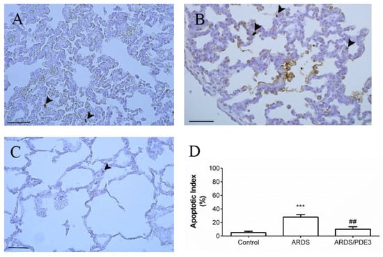 Apoptosis of lung epithelial cells visualized by TUNEL methods after the 4h therapy. Representative microphotographs of the lungs of healthy controls (A); animals with non-treated ARDS (B) and animals with ARDS treated with olprinone (C) using the TUNEL method for detection of apoptosis, scale bars: 50 μm. (D) Relative values of the apoptotic index. Arrowheads indicate a higher number of apoptotic (dark brown) nuclei of epithelial cells in the alveoli (A), (B). After treatment with olprinone, a decreased number of apoptotic alveolar cells was found (C). Statistical comparisons: for ARDS vs. Control *** p < 0.001; for ARDS/PDE3 vs. ARDS ## p < 0.01. Data are presented as means ± SEM.