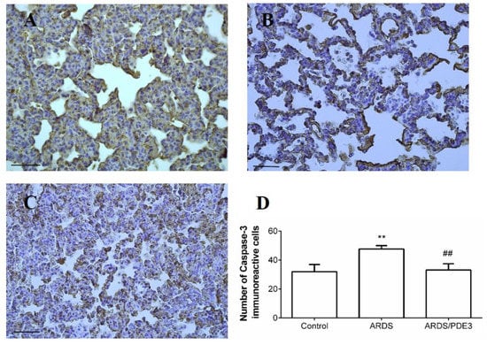 Apoptosis of lung epithelial cells visualized by caspase-3 immunohistochemical staining. after the 4h therapy. Representative microphotographs of the lungs of healthy controls (A); animals with non-treated ARDS (B) and animals with ARDS treated with olprinone (C) using the TUNEL method for detection of apoptosis, scale bars: 50 μm. (D) Relative values of the activated caspase-3 immunoreactive alveolar cells. Statistical comparisons: for ARDS vs. Control ** p < 0.01; for ARDS/PDE3 vs. ARDS ## p < 0.01. Data are presented as means ± SEM.