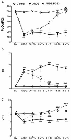 Changes in gas exchange indexes during the experiment. (A) The ratio of arterial oxygen partial pressure to the fraction of inspired oxygen (PaO2/FiO2); (B) oxygenation index (OI), and (C) ventilation efficiency index (VEI) before (basal value, BV) and after lung lavage (ARDS), 30 min (30′) after ARDS and therapy (Th) administration during 4 h (h) of the experiment in healthy ventilated and non-treated animals (Control group), in non-treated animals with ARDS (ARDS group) and animals with ARDS treated with olprinone (ARDS/PDE3 group). Statistical comparisons: for ARDS vs. Control *** p < 0.001; for ARDS/PDE3 vs. ARDS # p < 0.05, ### p < 0.001. Data are presented as means ± SEM.