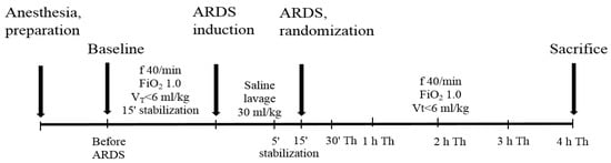 Timeline representation of the experimental protocol. ARDS = acute respiratory distress syndrome, VT = tidal volume, f = frequency, FiO2 = fraction of inspired oxygen.