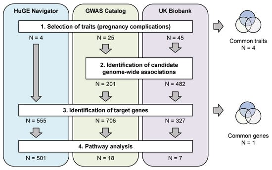 At first stage of our analysis, we obtained data for pregnancy-related traits from the three major data sources: the Public Health Genomics and Precision Health Knowledge Base (PHGKB v6.2.1) HuGE Navigator [], the National Human Genome Research Institute (NHGRI) GWAS Catalog [], and the UK Biobank (UKB) genetic and phenotypic dataset (summary GWAS statistics provided by the Neale lab were used). We primarily focused on the four most common pregnancy complications that require clinical decision making (gestational diabetes mellitus (GDM), placental abruption (PA), preeclampsia (PE), and preterm birth (PTB)). These four traits are the most commonly studied ones. Increasing interest in finding genetic markers associated with them is not surprising since family-based and ethnic studies confirm the possibility of a genetic contribution to the risk of all pathologies [,,,,]. For HuGE Navigator, we manually searched for data on these major traits, For GWAS Catalog and UK Biobank resources that represent large-scale GWAS data (that often lack statistical power and are thus less sensitive) we decided to conduct a broader search, selecting pregnancy-related traits automatically using a set of keywords, with additional curation step performed afterwards. Such filtering resulted in a set of 25 and 45 traits obtained from each resource, respectively.