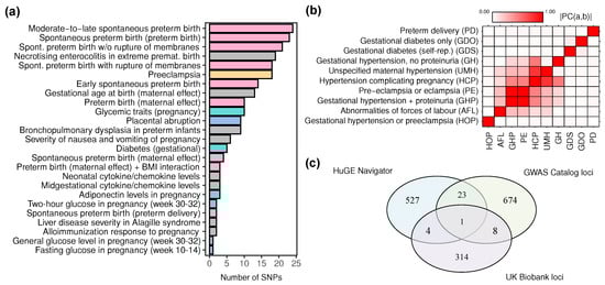 Summary of the genome-wide associations derived from the GWAS Catalog and the UK Biobank genetic dataset (a) Number of variants recorded in the GWAS Catalog for each of the 25 selected pregnancy-related traits. Color represents the grouping of traits (see Text), gray color represents additional traits that were not analyzed in detail. (b) A heatmap representing the reconstructed phenotypic correlation matrix for the selected traits in the UK Biobank genetic dataset. (c) Overlap between sets of genes identified from the HuGE Navigator, GWAS Catalog, and the UK Biobank dataset.