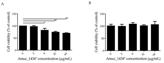 Amuc_1434* inhibited the proliferation of colorectal cancer LS174T cells. (A) LS174T cells and (B) Human epidermal melanoma (HEM) cells treated with various concentrations (0, 2, 8, 32, and 64 μg/mL) of Amuc_1434* for 24 h. The viability of LS174T and HEM cells was detected via 3-(4, 5-dimethylthiazol-2-yl)-2,5-diphenyltetrazolium bromide (MTT) assay. (Data are expressed as mean ± standard deviation, n = 3, *: p < 0.05; **: p < 0.01.).