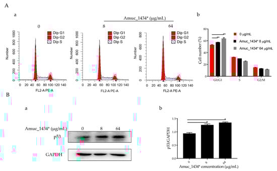Amuc_1434* treatment induced G0/G1-phase cell-cycle arrest. (A) Cell cycle analysis. (a) LS174T cells were treated with Amuc_1434*, and cell-cycle distribution was evaluated by flow cytometry. (b) Percentages of G0/G1 phase of the cell cycle in LS174T cells are shown. (Data are expressed as mean ± standard deviation, n = 3, *: p < 0.05.) (B) Western blotting analysis for the expression level in LS174T cells of tumor protein 53 (p53) (a), which controls the start of the cell cycle, after treatment with Amuc_1434*. GAPDH was used as the loading control. (b) Quantification of p53 expression levels in LS174T cells. (Data are expressed as mean ± standard deviation, n = 3, *: p < 0.05.).