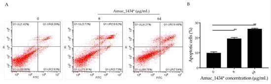 There is a dynamic balanced relationship between cell proliferation and apoptosis regulated by multiple genes under normal circumstances. Any abnormality in one of the links breaks this balance and causes excessive cell proliferation, which eventually leads to tumorigenesis [43]. Apoptosis (the opposite of cell proliferation) plays an important role in the inhibition of cancer cell proliferation. Flow cytometry was used in the current study to detect the apoptosis of LS174T cells, which were treated for 24 h with 8 μg/mL and 64 μg/mL Amuc_1434*. The apoptosis rate was 9.73% in the control group, 19.32% in the low-concentration (8 μg/mL) treatment group, and 25.15% in the high-concentration (64 μg/mL) treatment group (Figure 3). Thus, the apoptosis of LS174T cells was promoted by Amuc_1434* in a concentration-dependent manner.
