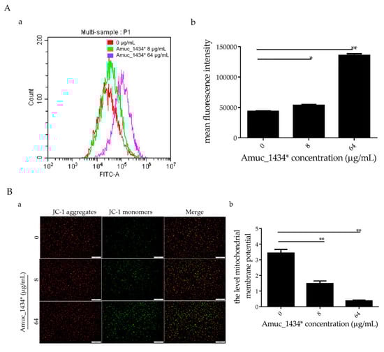 In the early stages of apoptosis, the level of intracellular reactive oxygen species (ROS) increases [44]. In this study, LS174T cells treated with Amuc_1434* were co-incubated with the probe 2,7-Dichlorodi-hydrofluorescein diacetate (DCFH-DA) for flow cytometry detection. When compared with the control group, the ROS levels in LS174T cells increased by 18.45% after treatment with Amuc_1434* at 8 μg/mL, and increased more significantly (67.84%) after treatment with Amuc_1434* at 64 μg/mL (Figure 4A). Thus, Amuc_1434* increased the content of ROS in LS174T cells. Excessive production of ROS increases oxidative stress, which can lead to mitochondrial damage in human cells [45]. Hence, we investigated the effect of Amuc_1434* on the mitochondrial membrane potential of LS174T cells. Compared with the control group, JC-1 mainly existed as a monomer after treatment with Amuc_1434* at 8 μg/mL and 64 μg/mL (Figure 4B). This suggested that Amuc_1434* decreased the mitochondrial membrane potential of LS174T cells. Thus, Amuc_1434* may indirectly promote mitochondrial dysfunction by increasing the generation of intracellular ROS.