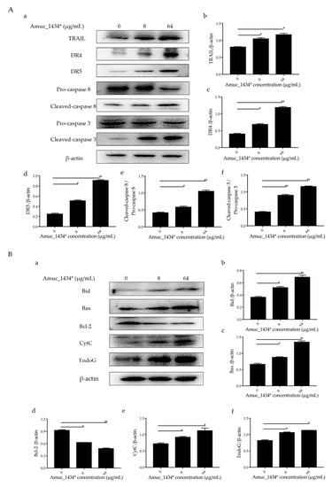 Amuc_1434* mediated the activation of the apoptosis pathway in LS174T cells. (A) The expression of death receptor 4 (DR4), death receptor 5 (DR5), cysteinyl aspartate specific proteinase 8 (caspase 8) and cysteinyl aspartate specific proteinase 3 (caspase 3) induced by Amuc_1434* in LS174T cells was dependent on tumor necrosis factor-related apoptosis-inducing ligand (TRAIL). (a) LS174T cells were treated with 8 and 64 μg/mL Amuc_1434* for 24 h, respectively. The cell lysates were analyzed by Western blot. (b–d) The quantification of TRAIL, DR4, and DR5 levels relative to that of the internal control (β-actin). (e) The cleaved-caspase 8/pro-caspase 8 ratio and (f) the cleaved-caspase 3/pro-caspase 3 ratio. (Data are expressed as mean ± standard deviation, n = 3, *: p < 0.05; **: p < 0.01.) (B) Amuc_1434* indirectly affected the expression of proteins in the mitochondrial apoptosis pathway. (a) B-cell lymphoma-2 interacting-domain death agonist (Bid), B-cell lymphoma-2-Associated X Protein (Bax), B-cell lymphoma-2 (Bcl-2), Cytochrome c (CytC), and Endonuclease G (EndoG) proteins of LS174T cells were detected using Western blot analysis after treatment with Amuc_1434* for 24 h. β-actin was used as the loading control. (b–f) The results of the Western blot were analyzed using Image J software. (Data are expressed as mean ± standard deviation, n = 3, *: p < 0.05; **: p < 0.01.).