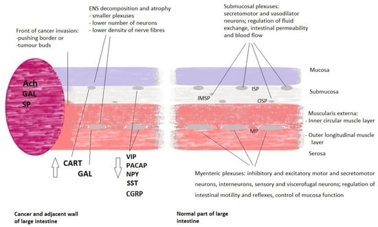 - Godlewski, J. Morphological changes in the enteric nervous system caused by carcinoma of the human large intestine. Folia Histochem. Cytobiol. 2010, 48, 157–162. [Google Scholar] [CrossRef]