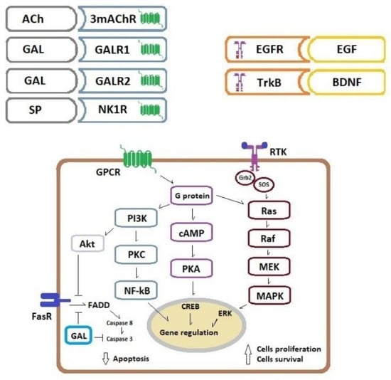 - Lang, R.; Gundlach, A.L.; Kofler, B. The galanin peptide family: Receptor pharmacology, pleiotropic biological actions, and implications in health and disease. Pharmacol. Ther. 2007, 115, 177–207. [Google Scholar] [CrossRef]