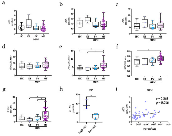 Box-and-whiskers plots for plasma levels of arachidonoyl-ethanolamide (AEA), (a) palmitoyl-ethanolamide (PEA); (b) oleoyl-ethanolamide (OEA); (c) PEA/AEA ratio; (d) OEA/AEA ratio; (e) OEA/PEA ratio; (f) and 1/2-arachidonoyl-glycerol (2+1AG); (g) in HC (n = 10) and ET (n = 5), PV (n = 9), and MF (n = 41) patients. One-way ANOVA: * p ≤ 0.05. (h) 2+1AG plasma levels in PV patients at high risk (age of >60 years and/or having thrombosis history; n = 3) and low risk (age of <60 years and having no history of thrombosis; n = 6). T-test: * p ≤ 0.050. (i) Pearson’s correlation results between AEA and platelet count (PLT) in MPN patients (n = 43).