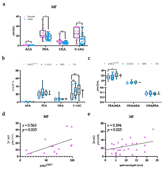 The large sample size available for the MF class (n = 41) allowed us to perform further investigations. Notably, sex differences were observed in MF, with higher NAE and 2+1AG levels in females (n = 19) compared with in males (n = 21) (AEA, p = 0.010; PEA, p = 0.022; OEA, p = 0.008; 2+1AG, p = 0.001; Figure 2a). According to the dynamic international prognostic scoring system (DIPSS) [32], MF patients displayed high risk in five cases (12.1%), intermediate-2 risk in 15 cases (36.6%), intermediate-1 risk in 13 cases (31.7%), and low risk in one case (2.4%). Besides, 15 (36.5%) patients were diagnosed as secondary MF, with five (12.1%) being post-PV MF and 10 (24.3%) being post-ET MF patients. No significant differences were detected in the EC and NAE profile among DIPSS risk categories and between primary and secondary MF.