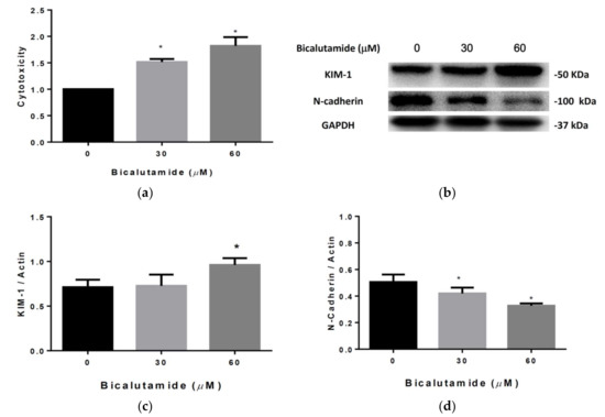 Lactate dehydrogenase (LDH) assay and the Western blot of kidney injury molecule (KIM)-1 and N-cadherin in rat mesangial cells (RMCs). Cells were treated with bicalutamide (Bic) at concentrations of 30 and 60 μM at 24 h. (a) LDH release was increased by Bic (n = 3, * p < 0.05). (b) A representative blot of protein expressions of KIM-1 and N-cadherin. GAPDH was used as an internal control. (c) Quantitative data of Western blotting of KIM-1(n = 3, * p < 0.05). (d) Quantitative data of Western blotting of N-cadherin (n = 3, * p < 0.05). When RMCs were treated with Bic, N-cadherin dose-dependently decreased, however KIM-1 was significantly induced in the group treated with 60 μM.