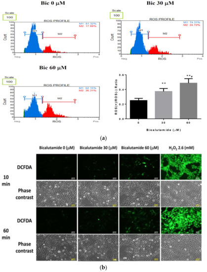 Measurement of oxidative stress. Reactive oxygen species (ROS) production induced by bicalutamide (Bic) was measured by (a) dihydroethidium (DHE) flow cytometry at 60 min and (b) dichlorodihydrofluorescein diacetate (DCFDA) staining at 10 and 60 min (# p < 0.05; ** p < 0.01; Scale bar=100 μM). Bic dose-dependently induced ROS production, as shown by DHE flow cytometry and DCFDA fluorescence staining. Data are expressed as the mean±standard deviation (n = 3).