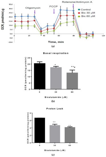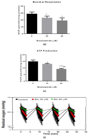 As the MMP was altered, we next used an Agilent Seahorse XFe96 Analyzer to determine whether Bic affects mitochondrial function and the bioenergenesis of RMCs. Normally, intracellular substrate oxidation produces ATP at the expense of oxygen consumption. The entire electron transport chain is predominantly controlled by parallel re-entry pathways through ATP synthase and proton leakage [70]. The addition of mitochondrial inhibitors such as a combination of rotenone (an inhibitor of complex I) and antimycin (an inhibitor of complex III) can completely shut down the electron transport chain even when complex V is already inhibited [71]. The entire range of the mitochondrial OCR measured by the Seahorse assay is shown in Figure 4a. Respective ranges of the OCR affected by the control and Bic at 30 and 60 μM were: basal respiration (20.4 ± 2.0, 17.3 ± 1.8 and 12.9 ± 4.0 pmol/min/μg protein), proton leakage (6.7 ± 1.0, 4.7 ± 1.1 and 4.1 ± 1.0 pmol/min/μg protein), maximal respiration (28.5 ± 3.0, 22.8 ± 3.0 and 18.8 ± 5.0 pmol/min/μg protein) and ATP production (14.7 ± 5.2, 12.9 ± 1.0 and 9.0 ± 1.0 pmol/min/μg protein) (Figure 4b–e). The basal respiration, maximal respiration and ATP production in RMCs were all significantly suppressed by treatment with Bic (60 μM) for 24 h (p < 0.05) (Figure 4b–e). Consistent with our results, Ming et al. indicated that a clinically relevant dose of Bic (2 mg/kg/day) (for a 70 kg male, about 140 mg per day) decreased tumor oxygenation by 45% within 24 h [72]. A rather interesting phenomenon reported by Pignatta et al. demonstrated that prolonged exposure to Bic therapy may generate an androgen-independent phenotype with alteration of mitochondrial dynamics and breakdown in the Drp-1-mediated mitochondrial network [73]. Recent studies demonstrated that targeting the phosphatidylinositide 3-kinase (PI3K)/AKT signaling pathway is a major strategy for treating androgen-independent PCa [74] or alternately meclofenamic acid can be prescribed. Meclofenamic acid is a nonsteroidal anti-inflammatory drug that has shown therapeutic potential for different types of cancers, including androgen-independent PCa [75]. The time point for intervention application was suggested to be at the point when the level of prostate-specific antigen retrogrades.