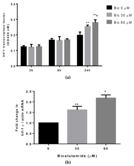 RMCs were cultured and treated with Bic as indicated. Total RNA was extracted, isolated and purified with a Novel Gene Total RNA Purification Mini Kit (Yu-Shing Biotech, Taipei, Taiwan) at 6 and 24 h. After the amount of RNA was quantified using a Nano-Drop 1000 Spectrophotometer (ThermoFisher Scientific, Waltham, MA, USA), 1 μg of RNA was subjected to a qPCR to produce complementary (c)DNA (GoScript™ Reverse Transcription System, Promega, Madison, WI, USA). A real-time thermocycler (Analytik Jena, Upland, CA, USA) was used to perform the reactions as follows—1 cycle of pre-denaturation at 95 °C for 3 min and then 35 cycles sequentially processed according to the sequence: denaturation at 95 °C for 15 s; annealing at 59 °C for 30 s; and extension at 72 °C for 30 s, followed by one cycle final extension at 72 °C for 10 min and one cycle cool-down at 4 °C for 10 min. The LabStarTM SYBR QPCR Kit (Taigen Bioscience, Taipei, Taiwan) was adopted for fluorescence detection. The respective primers used were: hif1α, forward 5’-CAATTCTCCAAGCCCTCCGA-3’ and reverse 5’-ATTCATCAGTGGTGGCAGTTG-3’ and β-actin, forward 5’-ATGGTGGGTATGGGTCAGAA-3’ and reverse 5’-CACACGCAGCTCATTGTAGA-3’. Amplifications was normalized to β-actin using the 2−△△CT method [87].