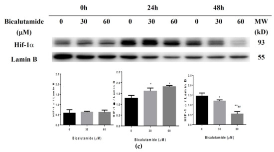 (a) Hypoxia-inducible factor (HIF)-1α transcriptional activity assay. Cells were untreated or treated with bicalutamide (Bic) at doses of 30 and 60 μM for 3–24 h and hif-1α transcriptional activity was analyzed with a commercial kit (Cayman). Hif-1α transcriptional activity had only increased at 24 h after treatment with Bic. (b) Quantitative polymerase chain reaction (qPCR) for hif-1α mRNA. Rat mesangial cells (RMCs) were treated with Bic at doses of 30 or 60 μM for 24 h. Total RNA was extracted and reverse-transcribed to cDNA. hif-1α mRNA was detected according the protocol of a commercial SYBR green QPCR kit (Taigen Bioscience). Hif-1α mRNA dose-dependently increased. (c) Western blot analysis of the HIF-1α protein in RMC cells. Cells were treated with the indicated doses of Bic for 0–48 h. Nuclear proteins were subfractionated from total cell lysates and loaded onto SDS-PAGE gels. Blots were detected using antibodies of HIF-1α and lamin B. Lamin B was used as an internal control. Levels of HIF-1α protein expression were quantified by Image J software and normalized to that of lamin B. Representative images are shown and quantitative data are from three replicates. Data are expressed as the mean±standard deviation. * p < 0.05, ** p < 0.01 compared to untreated cells; # p < 0.05, ## p < 0.01 compared to 30 μM Bic-treated cells.
