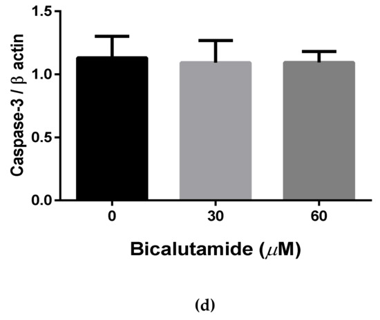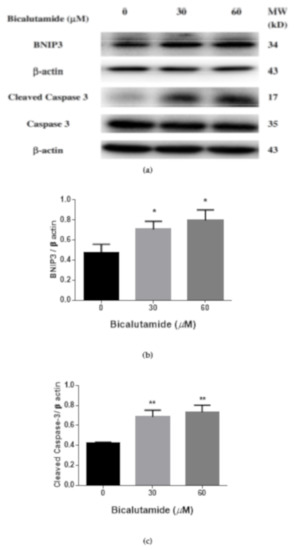 Expression and the quantitation of BCL2/adenovirus E1B 19 kDa protein-interacting protein 3 (BNIP3), cleaved-caspase-3 and caspase-3 in rat mesangial cells (RMCs) after being treated with bicalutamide (Bic) at 30 and 60 μM for 24 h. Total RMC lysates were loaded onto Western blots for analysis of BNIP3, caspase-3, cleaved caspase-3 and β-actin. β-actin served as the internal control. (a) Western blot of BNIP3 and cleaved caspase-3. (b) Bar diagram of BNIP3. (c) Bar diagram of cleaved caspase-3. (d) Bar diagram of caspase-3. Cleaved caspase 3 was significantly upregulated at 24 h after treatment. In contrast, caspase-3 was unaffectd (d). Data were obtained from triplicate determinations and results are expressed as the mean ± standard deviation. * p < 0.05, ** p < 0.01 compared to the control.