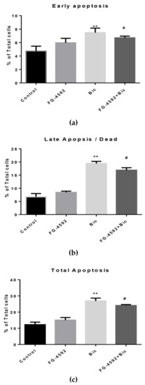 Annexin V analysis of apoptosis of rat mesangial cells (RMCs) mediated by bicalutamide (Bic) and FG4592. Cells were co-treated with Bic (60 μM) for 24 h in the presence and absence of FG4592 (2.5 μM). (a) Upper panel: early apoptosis. (b) Middle panel: late apoptosis/dead. (c) Lower panel: total apoptosis. A statistical analysis of the cytometric data showed that FG4592 partially reversed apoptotic cells induced by Bic. Triplicate data were statistically analyzed and results are expressed as the mean ± standard deviation. ** p < 0.01 compared to the control. # p < 0.05 compared to 60 μM Bic-treated cells.
