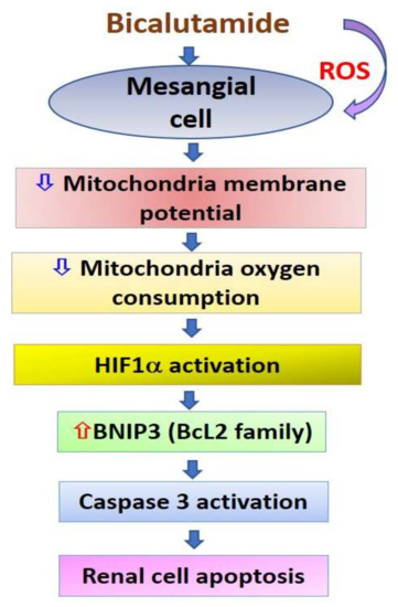 Alternately, Bic may exert apoptotic effects independent of its antiandrogenic ability. Bic decreases prostatic blood flow and induces apoptosis via a hypoxic pathway [28]. As usual, the cellular response to hypoxia is focused on hypoxia-inducible factors (HIFs) and HIF was demonstrated to be initially activated to attenuate renal injury in a chronic kidney disease (CKD) model of a subtotal nephrectomy [29,30]. Much of the literature has implicated chronic hypoxia as a common final pathway leading to the development of end-stage renal failure [31,32]. Hypoxia decreases the mitochondrial membrane potential (MMP) and suppresses the mitochondrial respiratory chain function, resulting in apoptosis of glomerular endothelial cells and a failure of tissue oxygenation following kidney injury [33,34,35], thereby stimulating transforming growth factor (TGF)-β-mediated fibroblast activation and contributing to renal fibrosis [36]. It is worth noting that hypoxia-related genes, including cyclin G2, BCL2-interacting protein 3 (BNIP3) and glucose transporter (Glut)-1, were shown to be highly expressed in LNCaP cells treated with Bic [37]. And more importantly, mitochondrial dysfunction gives rise to CKD progression irrespective of underlying causes [38].