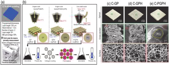 Figure 1a showed the modeling of scaffolds manufactured by the 3D printer (i) and theoretical macro-porosity calculation (ii). Consequently, the theoretical macro-porosity was calculated to be 37.7%. Scaffolds C-GP, C-GPH and C-PGPH, shown in Figure 1b, were fabricated via a low temperature 3D printing process and the material/processing parameters used are described in Table 1. The same processing temperature used to fabricate scaffold C-GP was used to fabricate scaffolds C-GPH and C-PGPH. Moreover, the barrel temperature was set to 37 °C to facilitate easy flow of the gelatin/PVA/HA mixture in the nozzle. Then, lyophilized scaffolds were coated with collagen and the collagen was fibrillated with salt. Images of the fabricated composite scaffolds (C-GP, C-GPH and C-PGPH) with fibrillated collagen on their surfaces are shown in Figure 1c–e.
