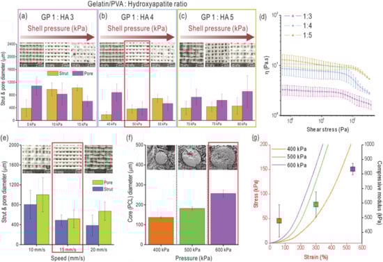 Printed strut and pore sizes for various pneumatic pressures and mixture ratios of gelatin/PVA (GP) and hydroxyapatite (HA) (a) 1:3, (b) 1:4 and (c) 1:5. (d) Complex viscosity (η) vs shear stress for various mixture ratios of GP and HA. (e) Strut and pore sizes for various nozzle moving speeds at a fixed mixture ratio (1:4) of GP and HA. (f) poly(ε-caprolactone) (PCL) diameter in the core region fabricated using a core/shell nozzle according to various pneumatic pressures applied in the core region and cross-sectional SEM images of the PCL-laden core regions. (g) Compressive stress-strain curves and moduli for various PCL diameters in the core region of the C-PGPH scaffold.