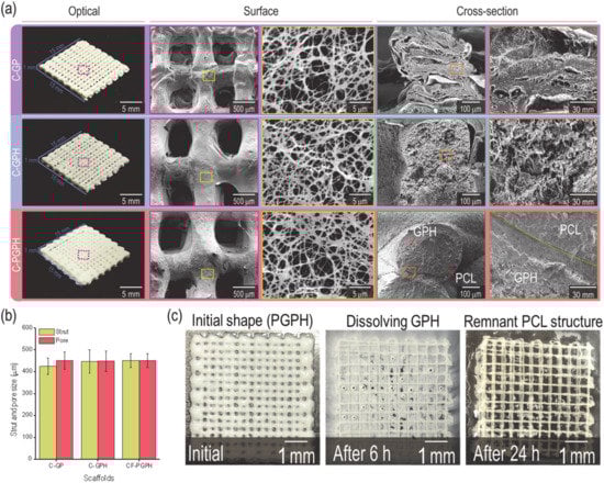 (a) Optical and SEM images of the fabricated scaffolds (C-GP, C-GPH and C-PGPH). (b) Measured strut and pore size of each scaffold. (c) Optical images showing strut changes after dissolving the GPH-laden shell region in 37 °C distilled water.
