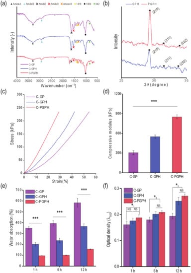 (a) Fourier-Transform Infrared (FTIR) spectra of scaffolds (C-GP, C-GPH and C-PGPH), (b) XRD results for C-GPH and C-PGPH scaffold. (c) Compressive stress-strain curves and (d) moduli of the scaffolds. (e) Water uptake ability and (f) protein absorption of the scaffolds at 1, 6 and 12 h. (NS > 0.05, p (*1) = 0.011, p (*2) = 0.006, p (*3) = 0.006 and *** p < 0.001).