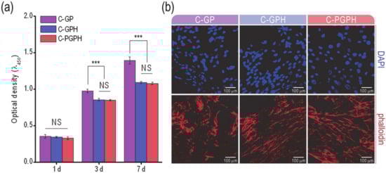 As shown in 3-(4,5-dimethylthiazol-2-yl)-2,5-diphenyl tetrazolium bromide (MTT) results in Figure 5a, all scaffolds resulted in increase in cell proliferation from day 1 to day 7. However, C-GP scaffold resulted in higher cell proliferation after day 3, compared to HA-laden scaffolds. To observe the morphology of cells cultured for day 7, nuclear (blue)/cytoskeletal (red) staining of the scaffolds was evaluated and the fluorescent images are shown in Figure 5b. Cells cultured on C-GPH and C-PGPH scaffoldsformed filamentous (F)-Actin fibers and exhibited a stretched, flattened morphology.